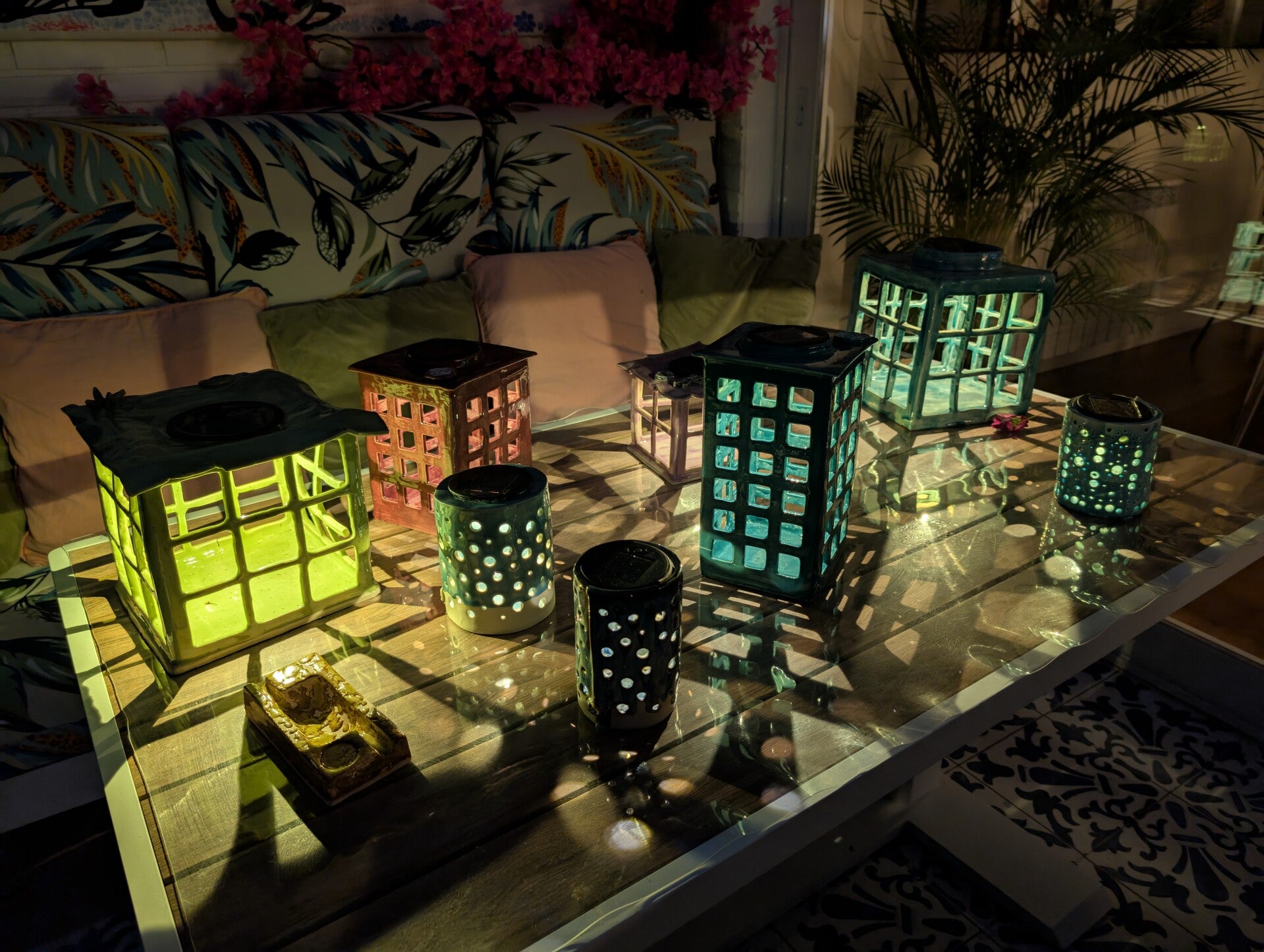 Descubre mi colección de faroles solares, creados en alta y baja temperatura. Cada farol irradia una luz cálida y acogedora, perfecta para iluminar tus espacios.