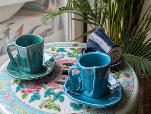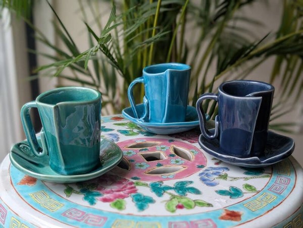 Juego de 3 tazas con plato. Hechas en baja temperatura. Aptas para lavavajillas y microondas.